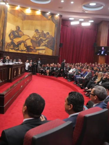 La vicepresidenta de la Cámara de Diputados, Dhauruely D´Aza, expone ante los presentes en el acto celebrado en el salón de la Asamblea Nacional.